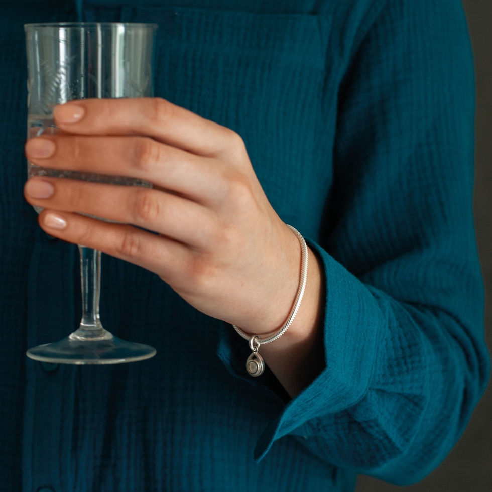 Like all of Remember's jewellery, the VIDA is set with one of our signature Stanhope lenses. When held up to the light, the Stanhope’s domed glass illuminates and magnifies your chosen photo. While the bracelet is being worn, your photo remains discreetly hidden.